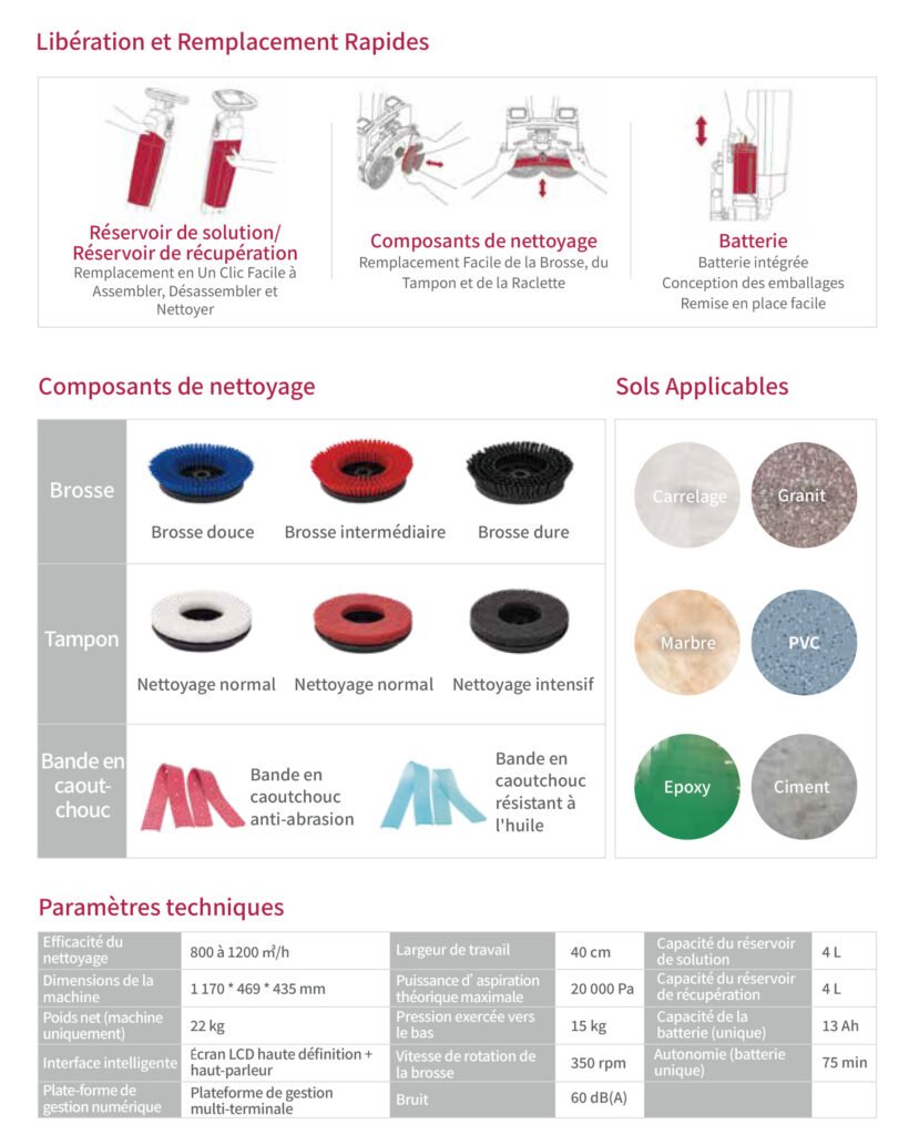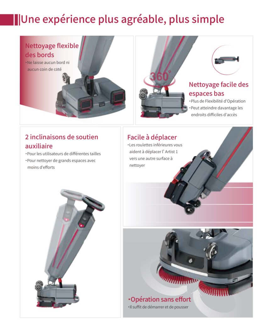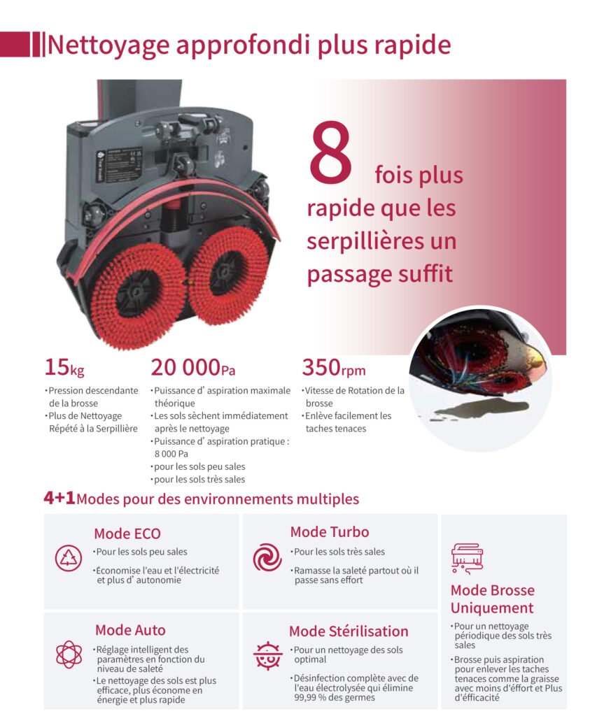 ·Les brosses rotatives à double sens permettent de frotter la surface du sol et d’éliminer rapidement les salissures, laissant un sol propre et sec en un seul passage.