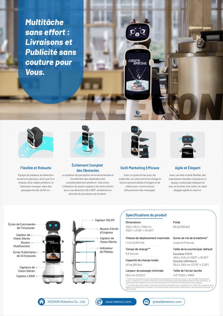 Avec un grand écran pour les publicités, ce robot prend en charge la lecture personnalisée d’images et de vidéos pour communiquer efficacement des messages.