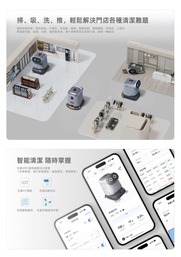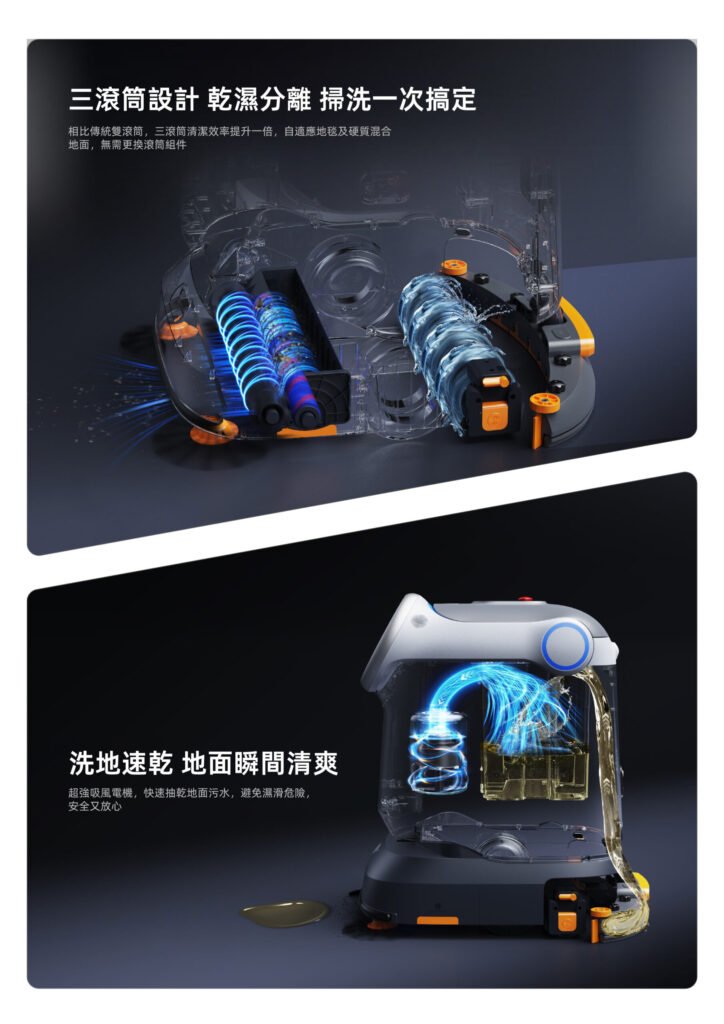 中小型空間的四合一專業地板清潔機器人,三重刷系統,用於乾濕分離。 適應各種場景。