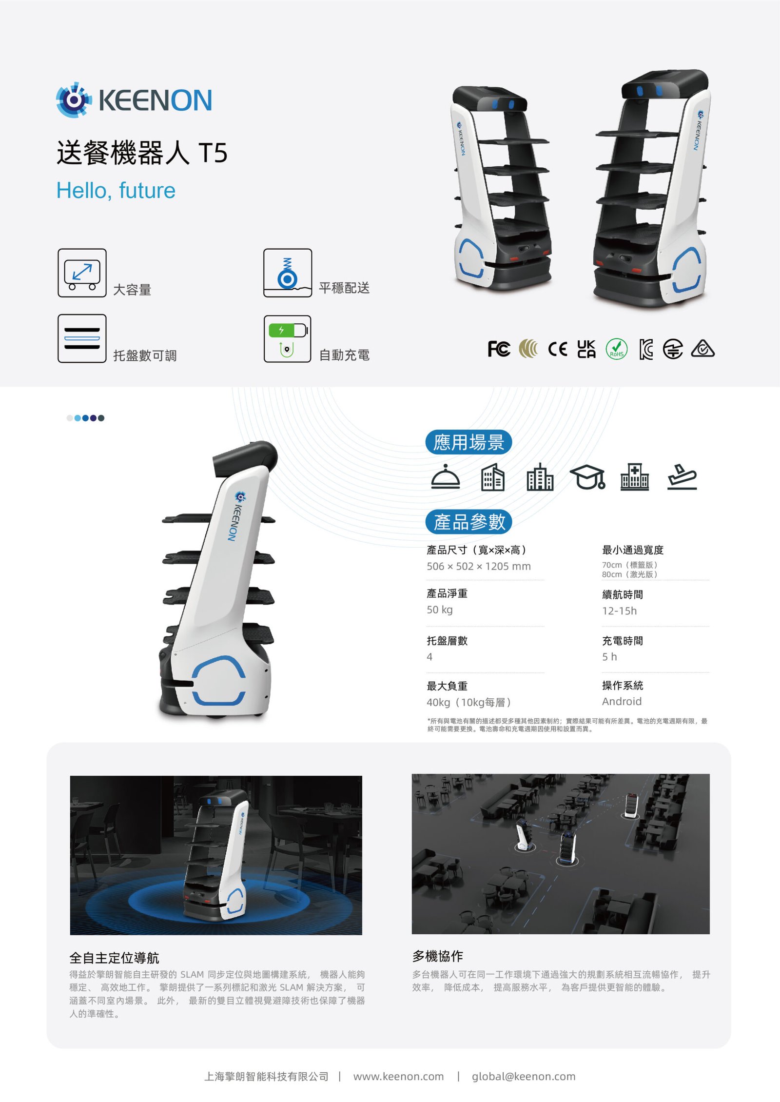 擎朗機器人設計了同步定位與地圖建構(SLAM)系統,以確保機器人的可靠性和效率。 KEENON 支援標記和雷射的 SLAM 解決方案,適用於各種室內情況。最新的雙眼立體視覺避障系統也保證了精準度。